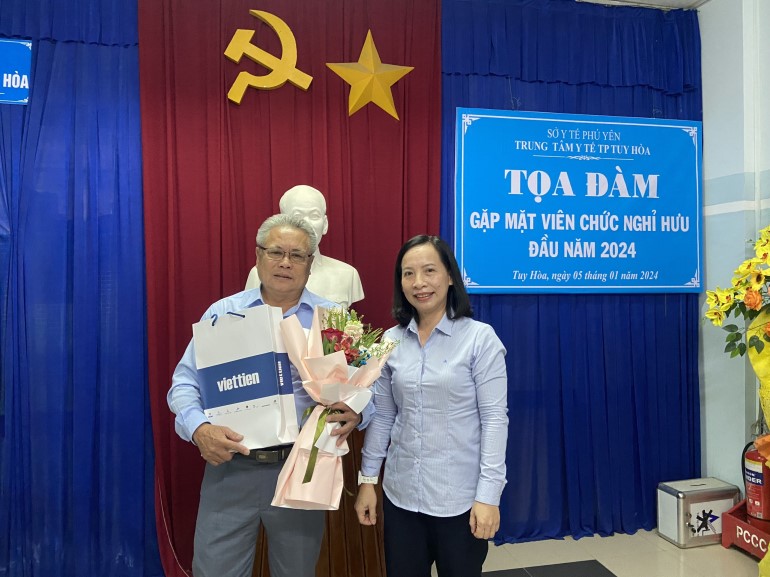 Cũng tại buổi gặp mặt, BS CKII Phùng Thị Phi Yến – Phó Giám đốc TTYT - Chủ tịch Công đoàn trao tặng bó hoa tươi thắm cùng lời tri ân sâu sắc và ghi nhận những đóng góp cả về sức lực, trí tuệ và tâm huyết của Bác sĩ Dương Bá Thạnh - Trưởng Trạm Y tế xã Hòa Kiến và YS Dương Tấn Hải – viên chức Phòng DS-YTCS với hơn 30 năm cống hiến, hoàn thành tốt các nhiệm vụ công tác tại đơn vị đồng thời chúc đồng chí về nghỉ chế độ mạnh khoẻ, hạnh phúc tiếp tục phát huy phẩm chất người cán bộ Y tế, theo dõi sự phát triển của ngành cũng như của đơn vị.