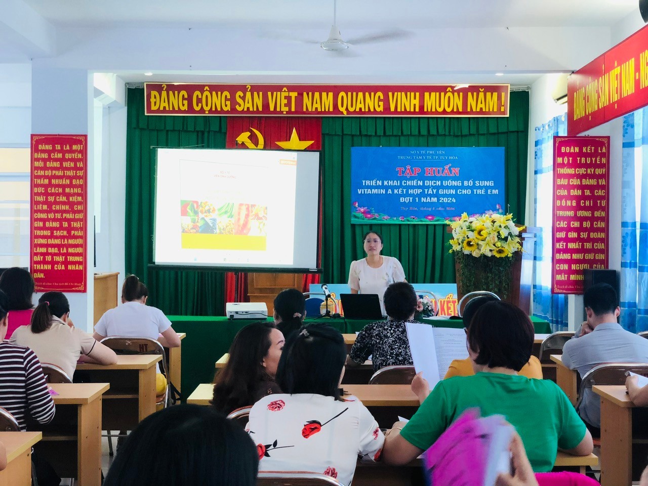 Vào ngày 27/5/2024, Trung tâm Y tế thành phố Tuy Hòa tổ chức tập huấn triển khai Chiến dịch uống bổ sung Vitamin A và tẩy giun đợt 1 năm 2024 cho cho đối tượng là trưởng/phó Trạm Y tế, cán bộ làm công tác dinh dưỡng tại các Trạm Y tế phường/xã.