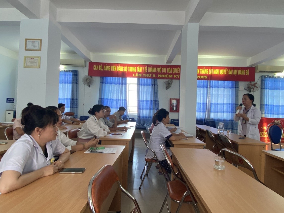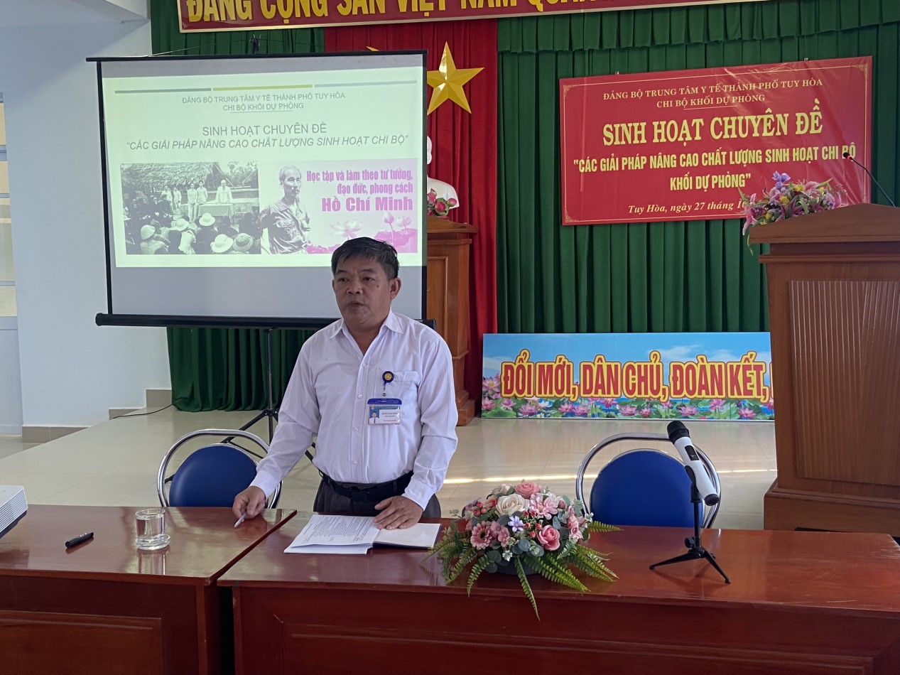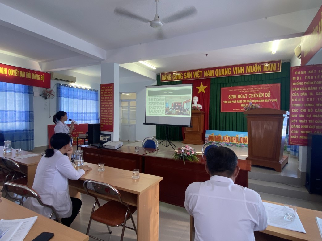 Thực hiện Kế hoạch số 02-KH/CB ngày 23/10/2023 của Chi Khối dự phòng về tổ chức sinh hoạt Chuyên đề năm 2023; Chiều ngày 27/10/2023, tại Hội trường tầng 5, Trung tâm Y tế thành phố Tuy Hòa, Chi bộ Khối dự phòng thuộc Đảng bộ Trung tâm Y tế thành phố Tuy Hòa tổ chức sinh hoạt chuyên đề “Các giải pháp về nâng cao chất lượng sinh hoạt chi bộ Khối Dự phòng”. Đến dự, chỉ đạo buổi sinh hoạt chuyên đề có đồng chí Phùng Thí Phi Yến – Phó Bí thư Đảng bộ Trung tâm Y tế thành phố, đồng chí Trần Ngọc Hải – Bí thư Chi bộ Khối Chức năng cùng với toàn thể đảng viên chi bộ Khối Dự phòng.