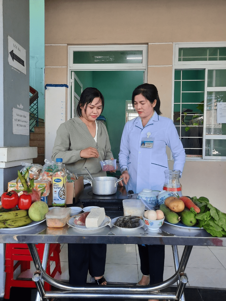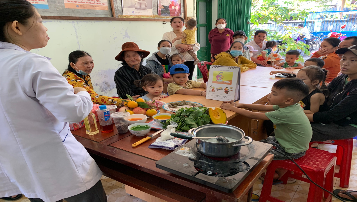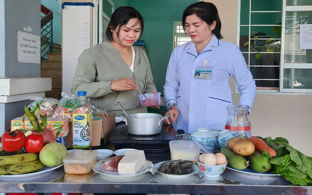 Ảnh: Quang cảnh hướng dẫn thực hành dinh dưỡng, kỹ thuật chế biến thức ăn cho bà mẹ đang mang thai, người chăm sóc trẻ em dưới 5 tuổi tại Trạm Y Tế Phường 3